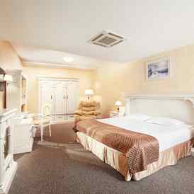 Номера варьируются в размерах и планировке, в каждом из них — прихожая, роскошная спальня с пространством гостиной и ванная комната. Интерьеры оформлены в светлых тонах, мебель изготовлена из массива дерева. Ванные комнаты укомплектованы банными и косметическими принадлежностями.